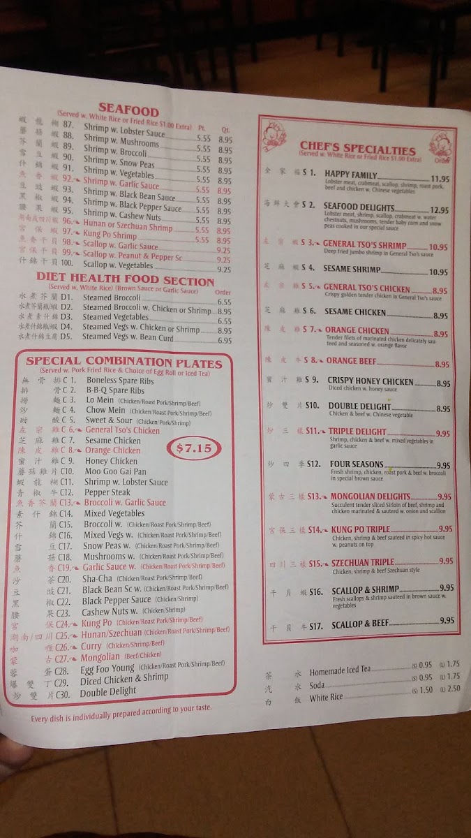 Seafood lovers will appreciate the variety—from Shrimp with Lobster Sauce to Scallops with Garlic Sauce and spicy Kung Po Shrimp, each prepared with fresh ingredients and bold flavors. Customer favorites like Kung Pao Chicken and Shrimp Fried Rice are praised for their balance of spices and freshness, creating an unforgettable taste experience.